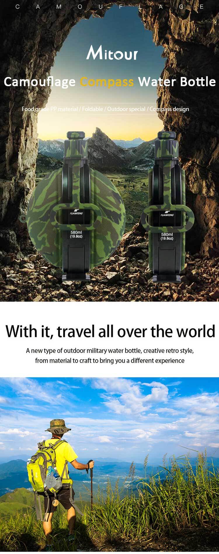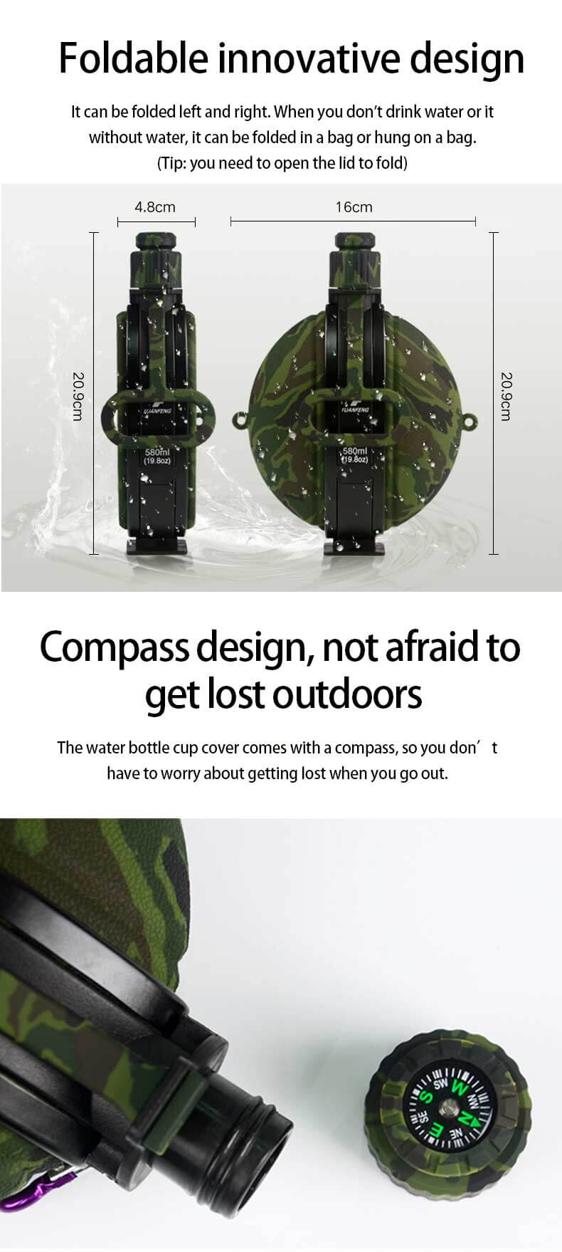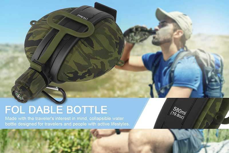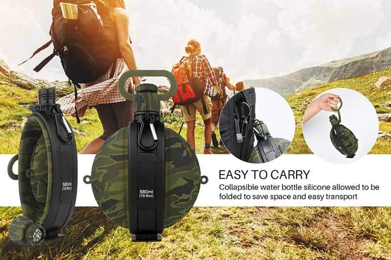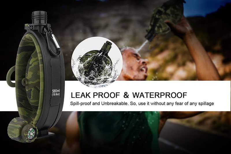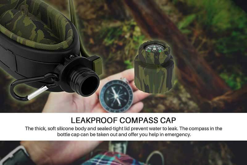 LEAKPROOF COMPASS CAP: The thick, soft silicone body and sealed-tight lid prevent water to leak. The compass in the bottle cap can be taken out and offer you help in emergency.