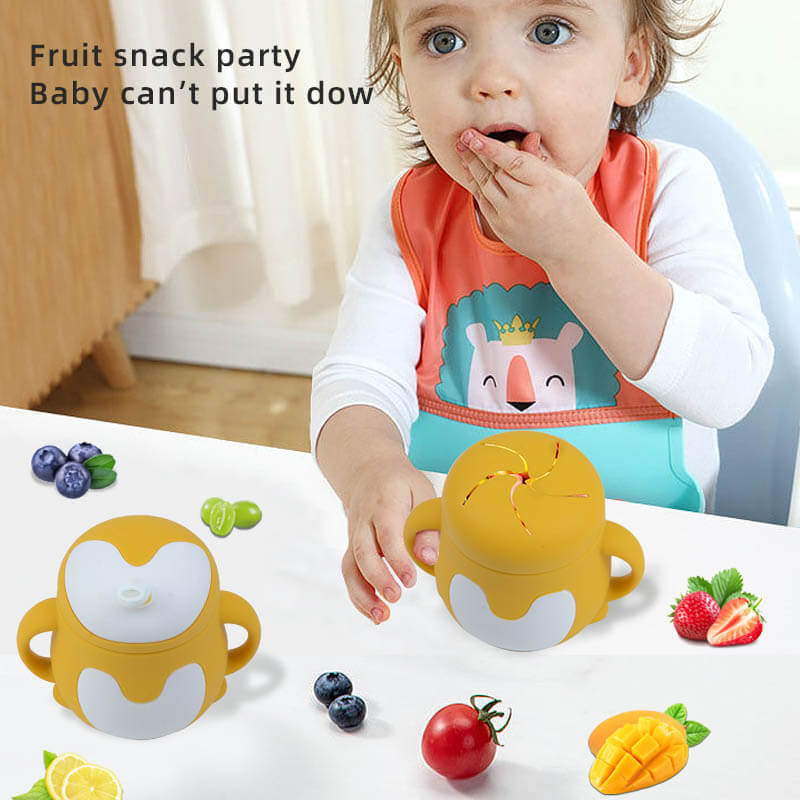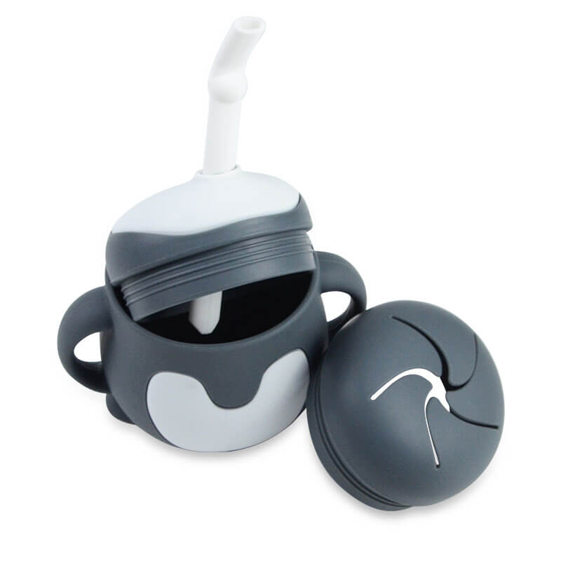Silicone Snack Cup: comes with 2 interchangeable lids, which can be used as a straw cup or as a baby snack container. Remove the lid, and there is an open drinking cup.